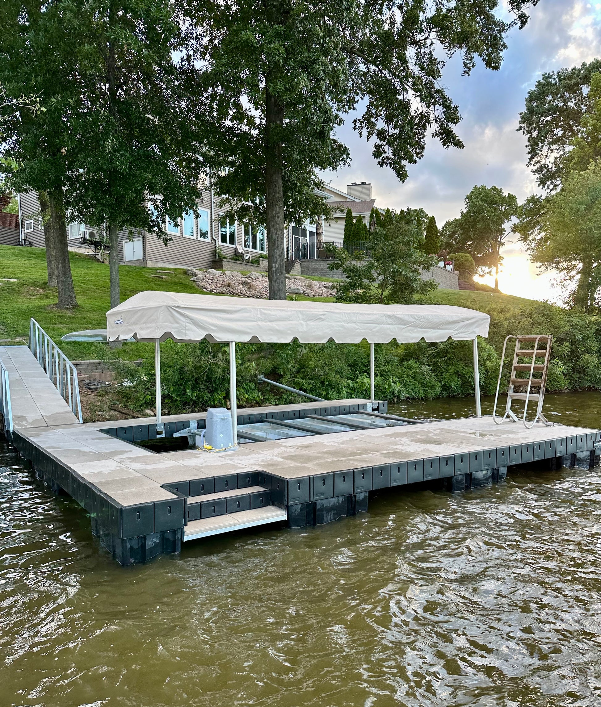 Dock steps integrated into your dock frame. Allows for easier access into lake, as well as a sitting ledge just above water level.