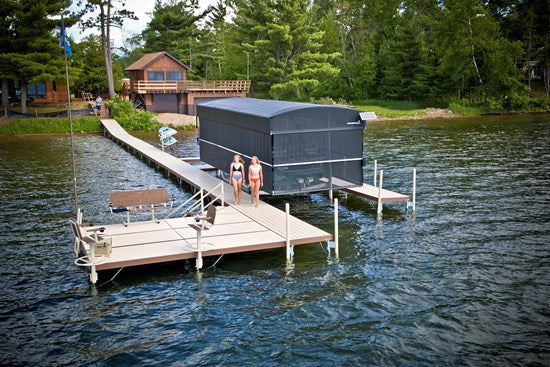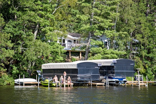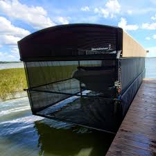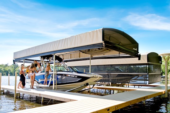 Equipped with exceptional weather resistant fabric and breathable SunTex 80 woven mesh ends for maximum protection and durability, the REVOLUTION™ Series Canopy is the most innovative boat lift canopy on the market. The canopy’s roll-up design allows for easy installation and storage, while the trussed side frame makes for a clean, structured appearance with hidden routing for electrical wiring. With optional features available such as the ShoreScreen, your boat or pontoon will have complete protection from wind and rain.